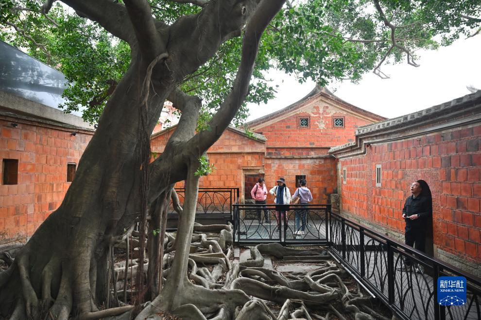 12月19日,游客在福建晉江梧林村閩南古民居德衛宅內參觀古榕樹。