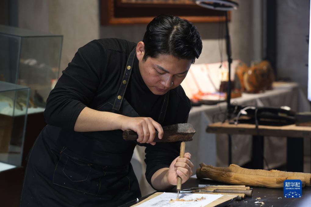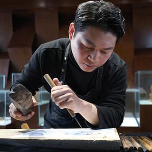 “95後”唐蜀輝是安徽省黃山市歙縣人,曾拜國家級非遺傳承人蒯正華為師學習木雕製作技藝,如今他是徽州三雕(木雕)市級代表性傳承人。歷史人物、亭&樓閣、花鳥魚蟲……唐蜀輝用刻刀在木料上創造出眾多層次分明、栩栩如生的形象,他的作品多次獲得國家級、省市級獎項。在鑽研雕刻技藝的同時,唐蜀輝也把目光投向更廣闊的市場。他成立團隊,開發文創産品,每天進行電商直播,讓木雕技藝為更多受眾,尤其是年輕人所知曉。“我希望自己未來能不斷學習不同風格的作品,在設計創作和工藝手法上都更加精進。”唐蜀輝説。