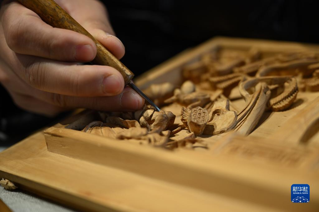 “95後”唐蜀輝是安徽省黃山市歙縣人,曾拜國家級非遺傳承人蒯正華為師學習木雕製作技藝,如今他是徽州三雕(木雕)市級代表性傳承人。歷史人物、亭&樓閣、花鳥魚蟲……唐蜀輝用刻刀在木料上創造出眾多層次分明、栩栩如生的形象,他的作品多次獲得國家級、省市級獎項。在鑽研雕刻技藝的同時,唐蜀輝也把目光投向更廣闊的市場。他成立團隊,開發文創産品,每天進行電商直播,讓木雕技藝為更多受眾,尤其是年輕人所知曉。“我希望自己未來能不斷學習不同風格的作品,在設計創作和工藝手法上都更加精進。”唐蜀輝説。