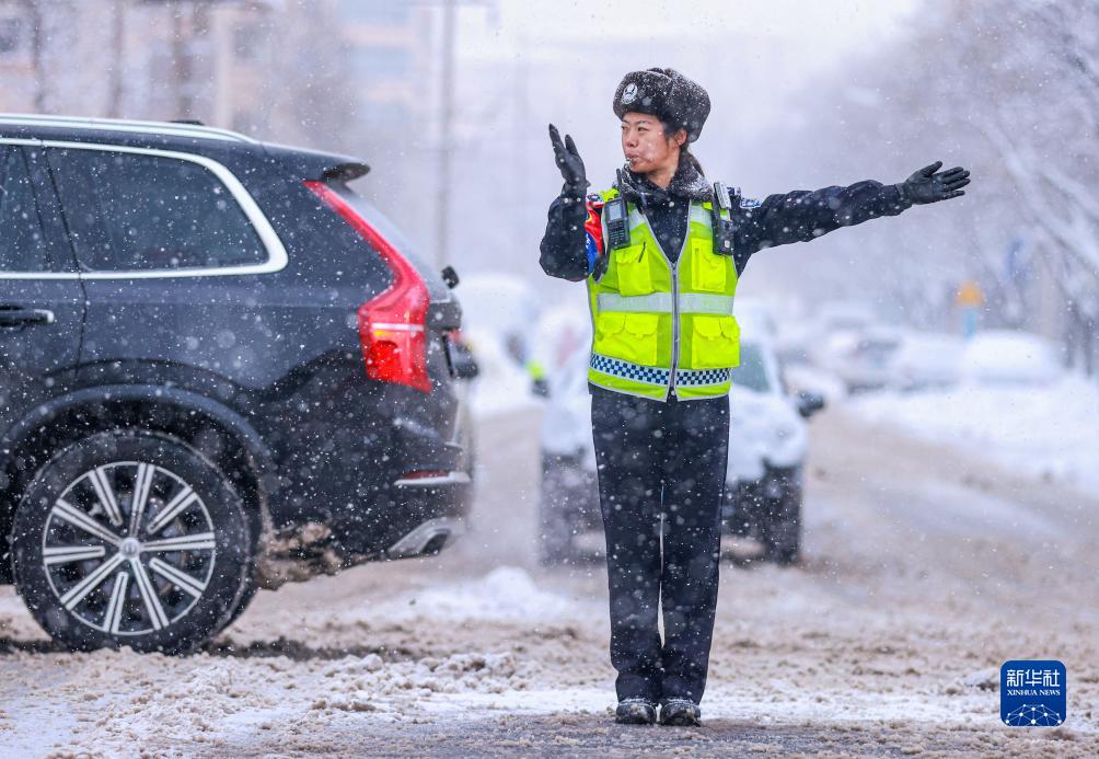 12月21日,在山東省榮成市成山大道一處路口,執勤交警在指揮交通。