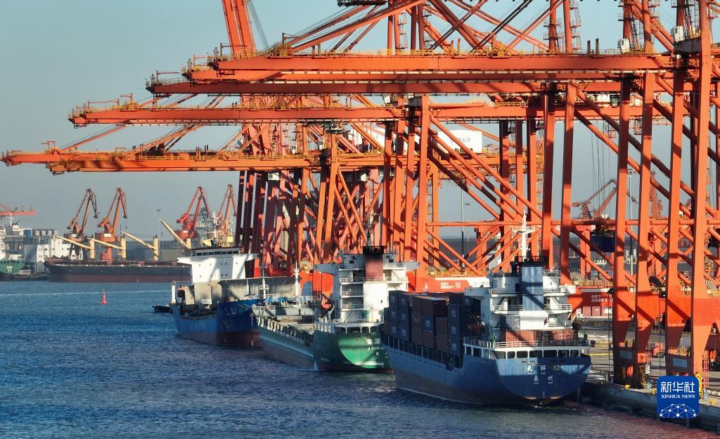 12月21日,三艘輪船靠泊在唐山港京唐港區集裝箱碼頭卸貨(無人機照片)。
