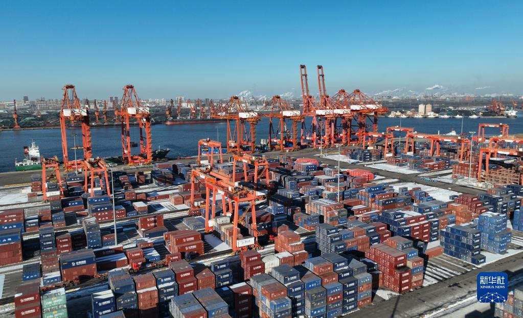 12月21日拍攝的唐山港京唐港區集裝箱碼頭堆場(無人機照片)。