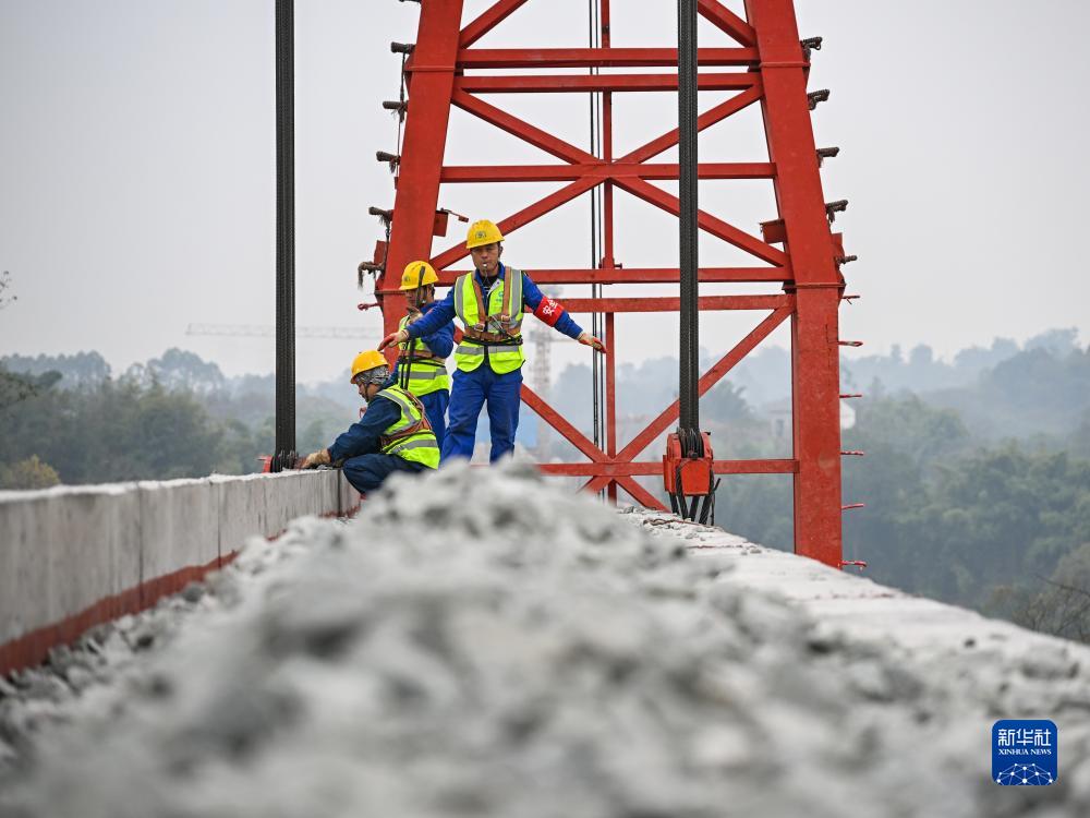 12月21日,在位於四川省瀘州市境內的隆黃鐵路隆敘段擴能改造項目鋪架工程施工現場,工人配合機械進行架梁作業。