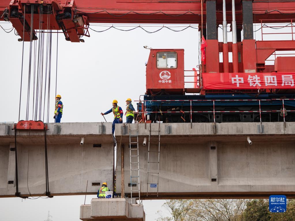 12月21日,在位於四川省瀘州市境內的隆黃鐵路隆敘段擴能改造項目鋪架工程施工現場,工人配合機械進行架梁作業。