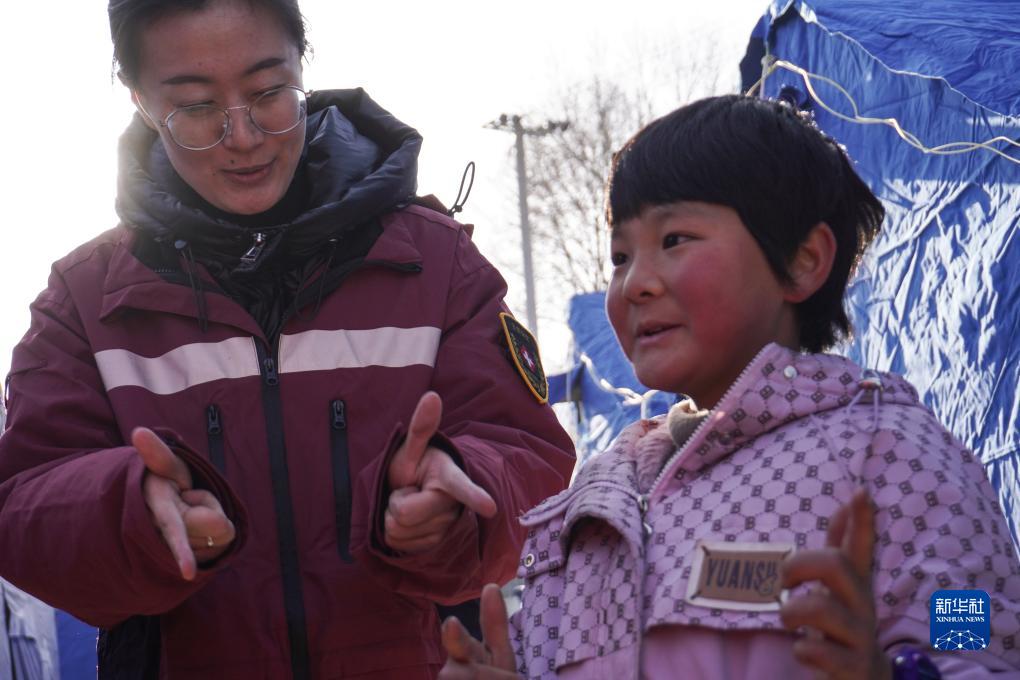 12月21日,在甘肅省臨夏州積石山縣劉集鄉陽洼村的一處臨時安置點,甘肅省心理救援隊隊員帶着孩子做游戲。