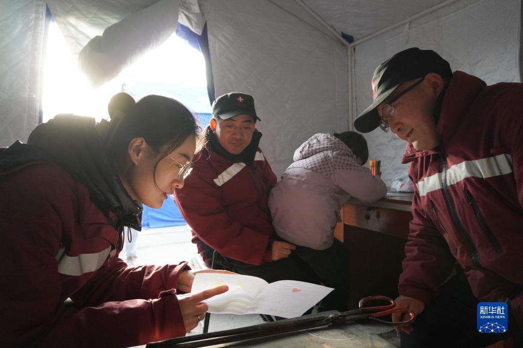 12月21日,在甘肅省臨夏州積石山縣劉集鄉陽洼村的一處臨時安置點的帳篷內,甘肅省心理救援隊隊員通過繪畫作品了解孩子們的情緒狀態。