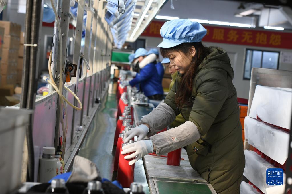 12月21日,浙江省永康市一家保溫杯生産企業車間內,檢驗人員在查看即將出廠的保溫杯産品。