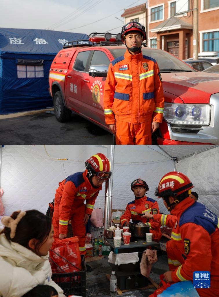 拼版照片:上圖為28歲的甘肅省臨夏州東鄉縣消防救援大隊指戰員水向東在受災群眾臨時安置點(12月21日攝)。東鄉縣消防救援大隊負責積石山縣大河家鎮大河村安置點的防火巡查、物資搬運、帳篷搭建等工作。由於受災群眾在帳篷內採用煤爐取暖,防火壓力較大,水向東和隊友們輪班進行不間斷巡查;下圖為12月21日,水向東(右二)和隊友們在大河村安置點的帳篷內對受災群眾進行防火宣傳。
