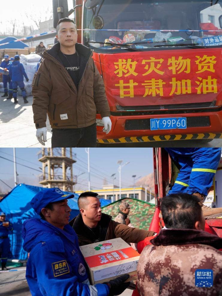 拼版照片:上圖為34歲的卡車司機杜偉在運輸救災物資的卡車前(12月21日攝)。地震發生後,杜偉從四川省巴中市平昌縣出發,帶着愛心企業捐贈的600套禦寒被服以及100箱方便麵和礦泉水趕往災區,歷經約12小時車程,於21日下午到達積石山縣大河家鎮大河村安置點;下圖為12月21日,杜偉(左二)幫助藍天救援隊隊員從自己的卡車上卸下救援物資。