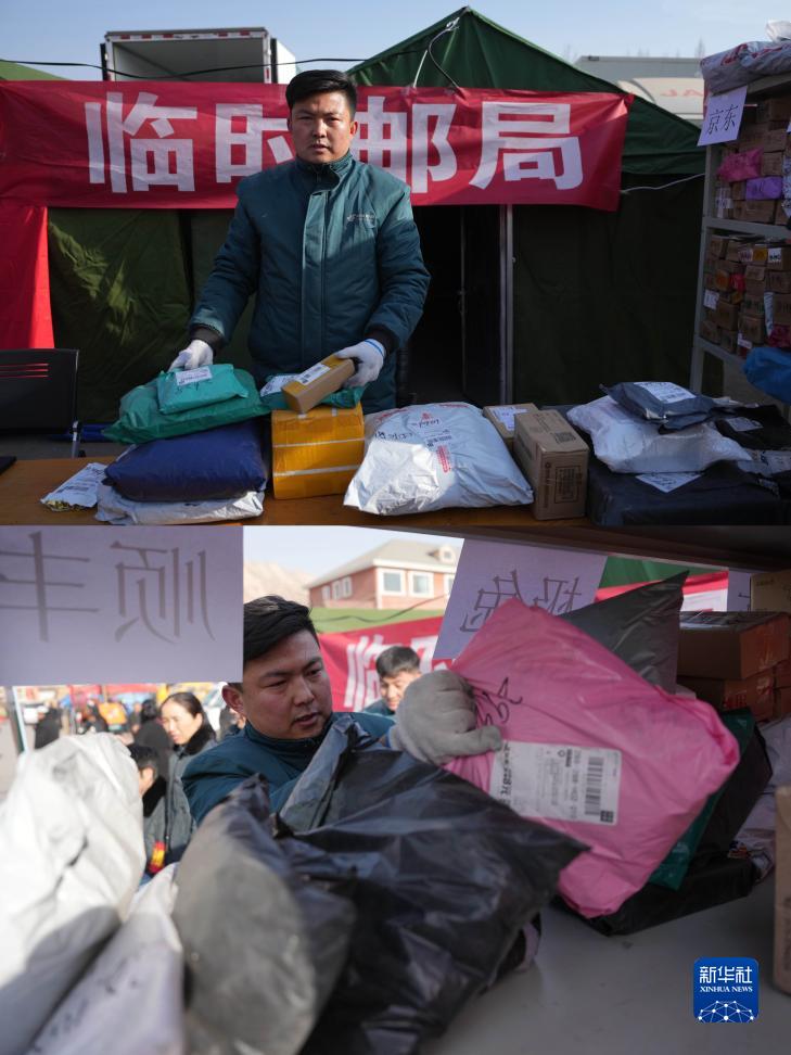 拼版照片:上圖為29歲的中國郵政積石山分公司投遞員趙玉山在受災群眾臨時安置點的臨時郵局內(12月21日攝)。震後,中國郵政積石山分公司緊急增加運力,保障受災群眾快遞收發;下圖為12月21日,趙玉山在大河村安置點的臨時郵局內清點快遞。