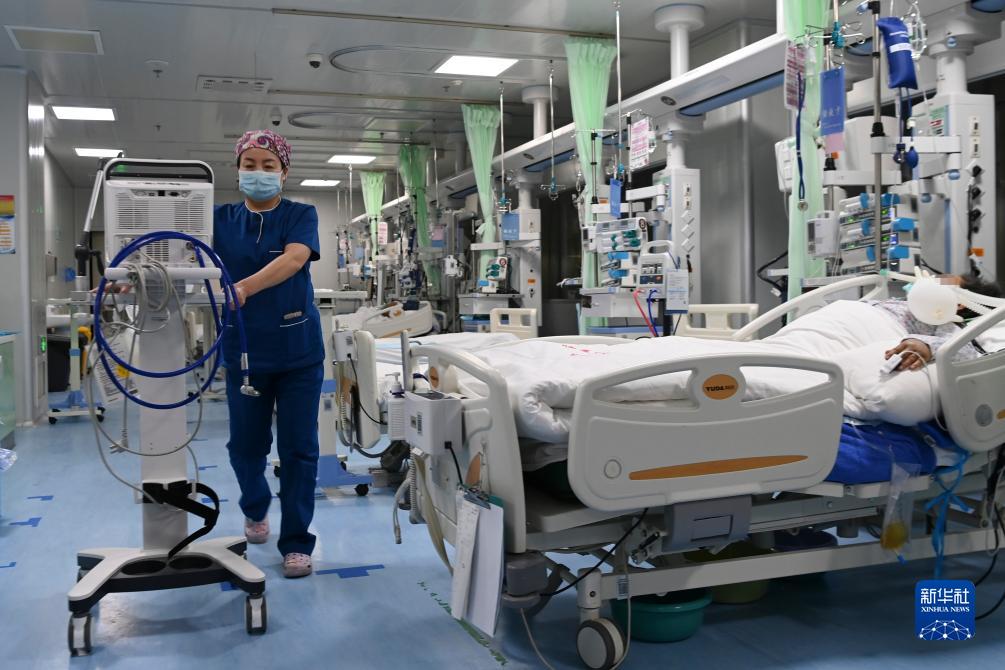 12月21日,在臨夏州人民醫院ICU,醫護人員搬運診療儀器。