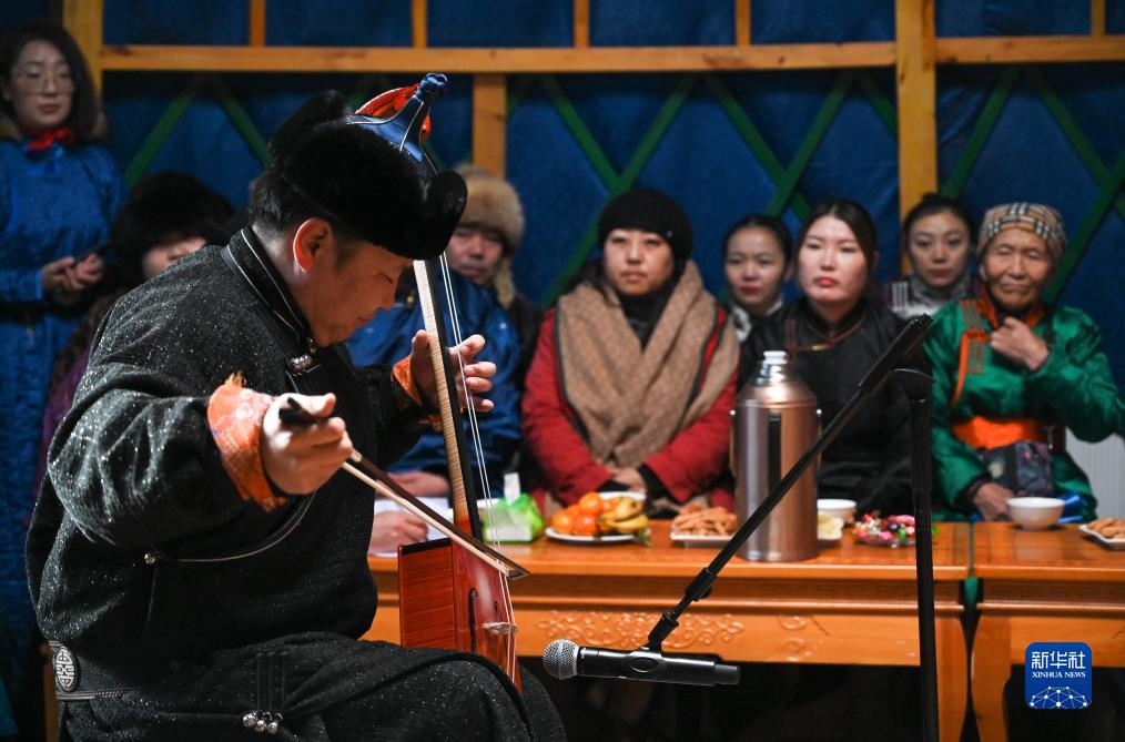 12月21日,烏蘭牧騎隊員在阿其圖烏拉蘇木進行馬頭琴演奏表演。