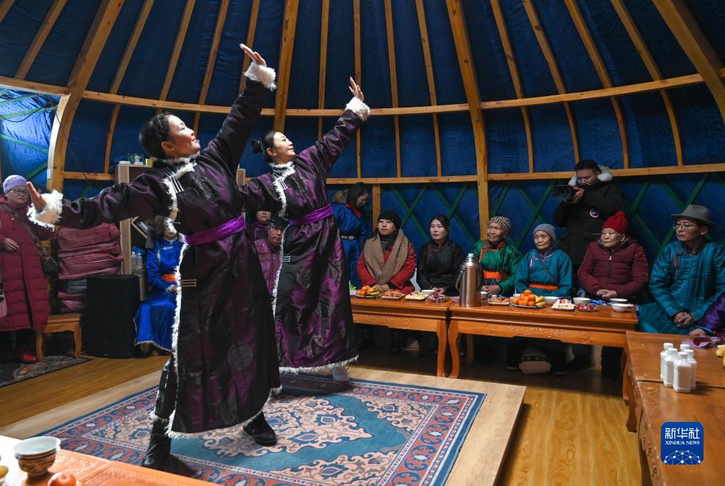 12月21日,烏蘭牧騎隊員在阿其圖烏拉蘇木進行舞蹈表演。