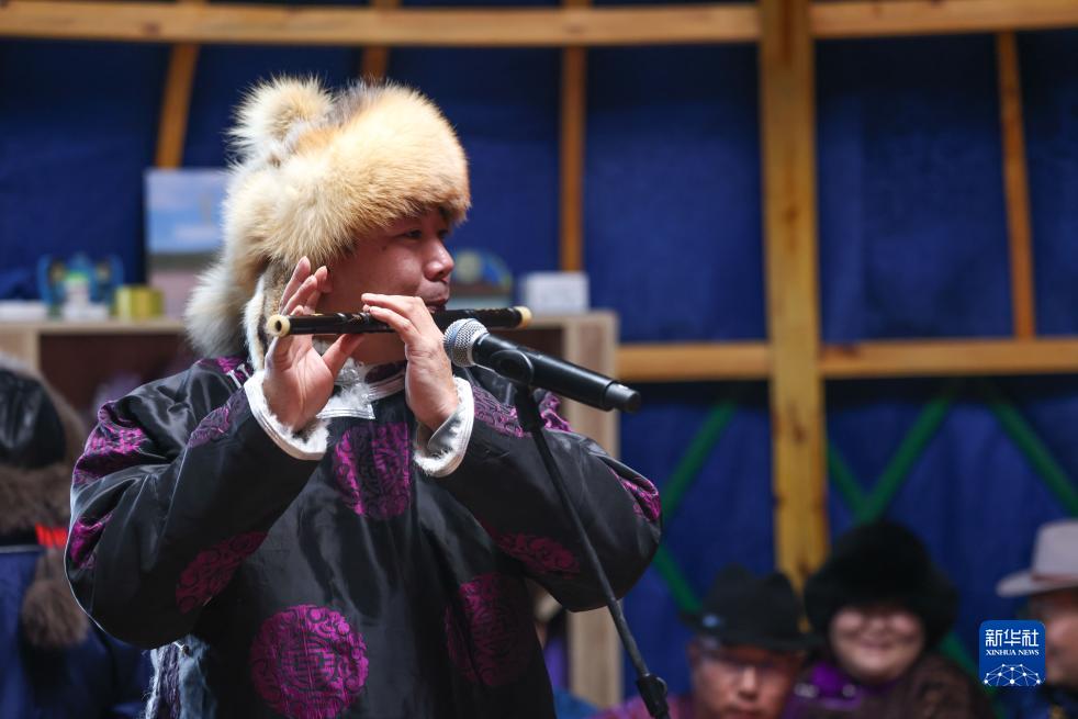 12月21日,烏蘭牧騎隊員在阿其圖烏拉蘇木進行笛子吹奏表演。