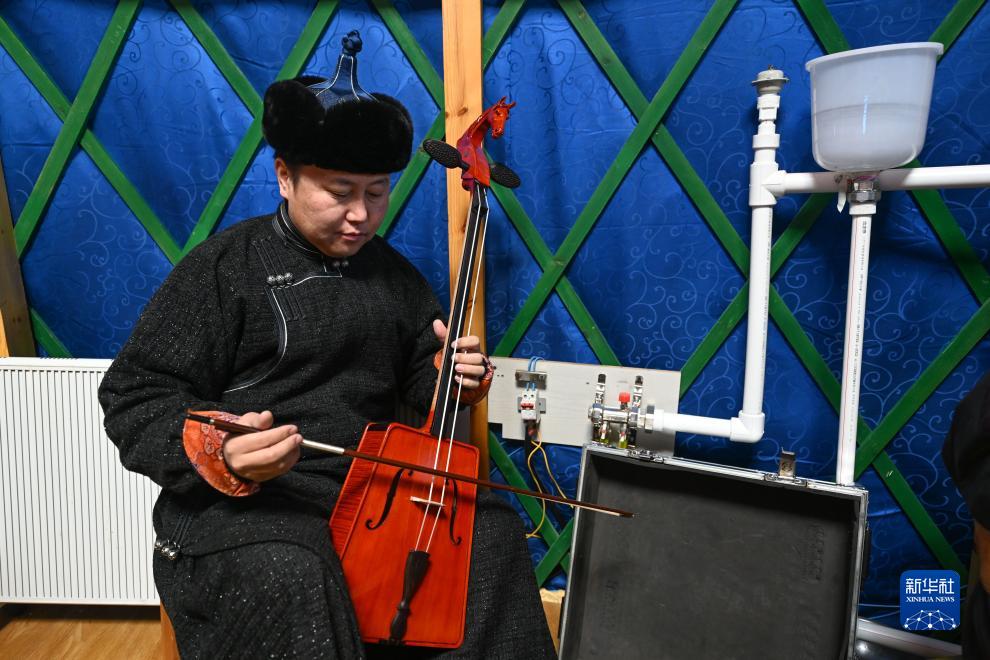 12月21日,在內蒙古錫林郭勒盟蘇尼特右旗阿其圖烏拉蘇木,烏蘭牧騎隊員在演出前練習馬頭琴。