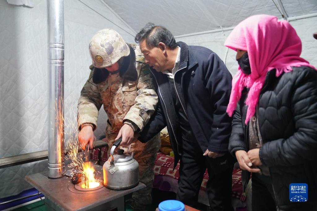 12月19日,在積石山縣柳溝鄉陽山村,陸軍第76集團軍某旅官兵為受災群眾搭建帳篷、點燃爐火。