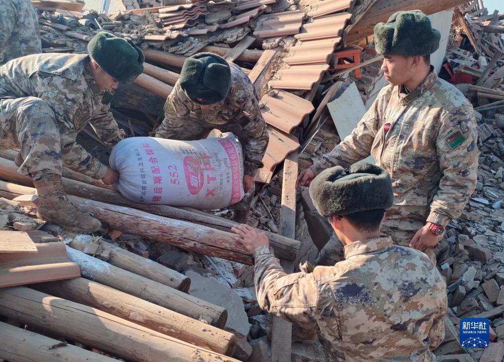 12月21日,陸軍第76集團軍某旅官兵在積石山縣石垣鎮秦陰村幫助受災群眾清理物資。