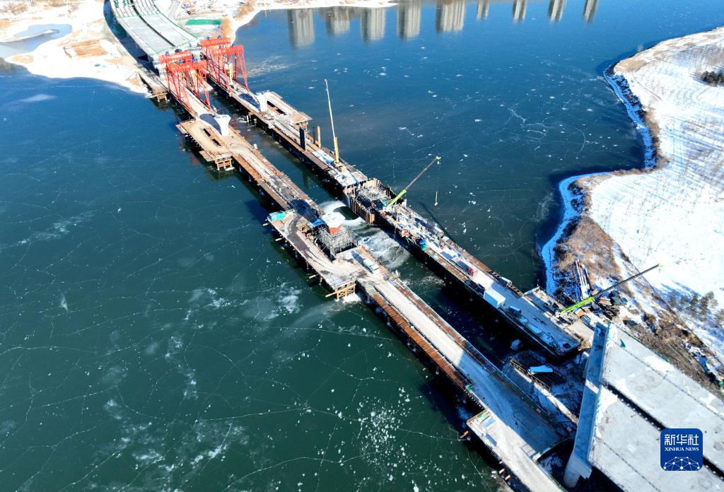 12月21日拍攝的廠通路潮白河大橋施工現場(無人機照片)。