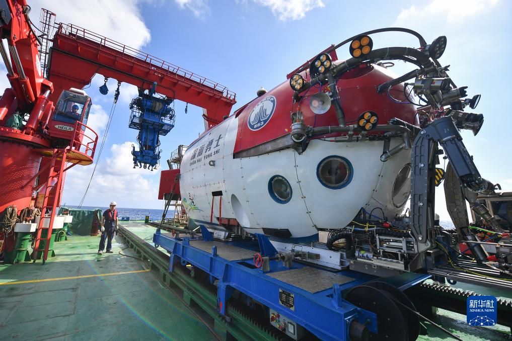 這是2023年5月26日在“探索一號”科考船上拍攝的“深海勇士”號載人潛水器,該潛水器用於水下考古數據採集。