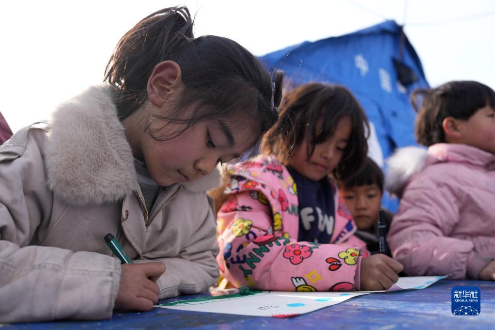 12月22日,在積石山縣大河家鎮大河村安置點,小朋友們在畫畫。