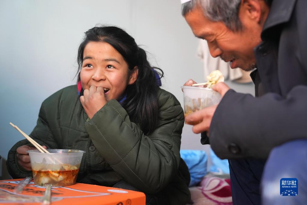 12月22日,在積石山縣大河家鎮梅坡村活動板房安置點,受災村民馬小梅(左)和爸爸一起吃餃子。