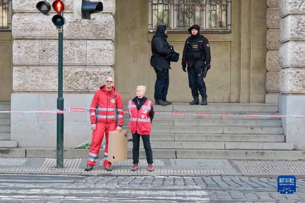 12月22日,在捷克首都布拉格,警察和捷克紅十字會工作人員在發生槍擊事件的查理大學文學院大樓前工作。