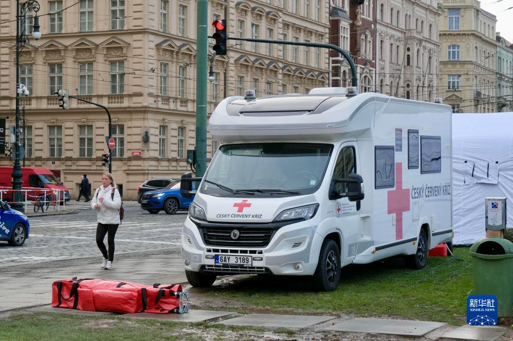 12月22日,在捷克首都布拉格,捷克紅十字會的車輛停在發生槍擊事件的查理大學文學院大樓附近。