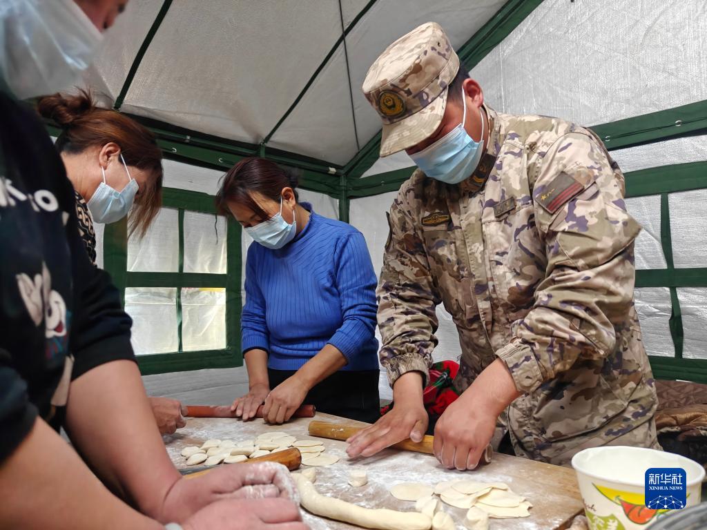 12月22日,武警青海總隊官兵在青海省民和縣中川鄉臨時安置點和受災群眾一起包餃子。