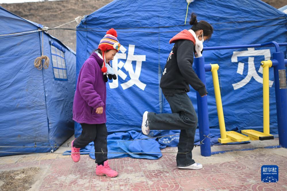 12月22日,在青海省海東市循化撒拉族自治縣道幃藏族鄉牙木村安置點,兩名小朋友在跳皮筋。