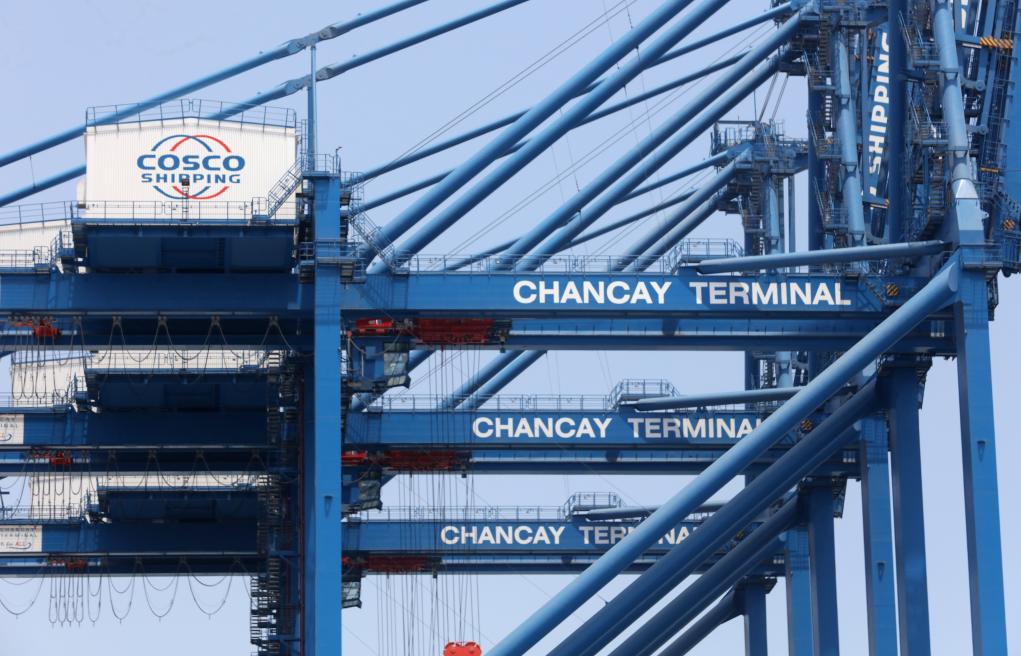 這是10月7日在秘魯錢凱港拍攝的印有“中遠海運”“錢凱碼頭”字樣的軌道吊。