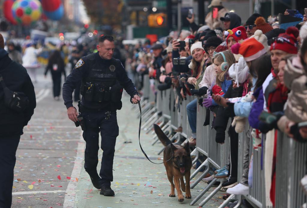 11月27日,在美國紐約,警察攜帶警犬在感恩節游行活動現場值守。