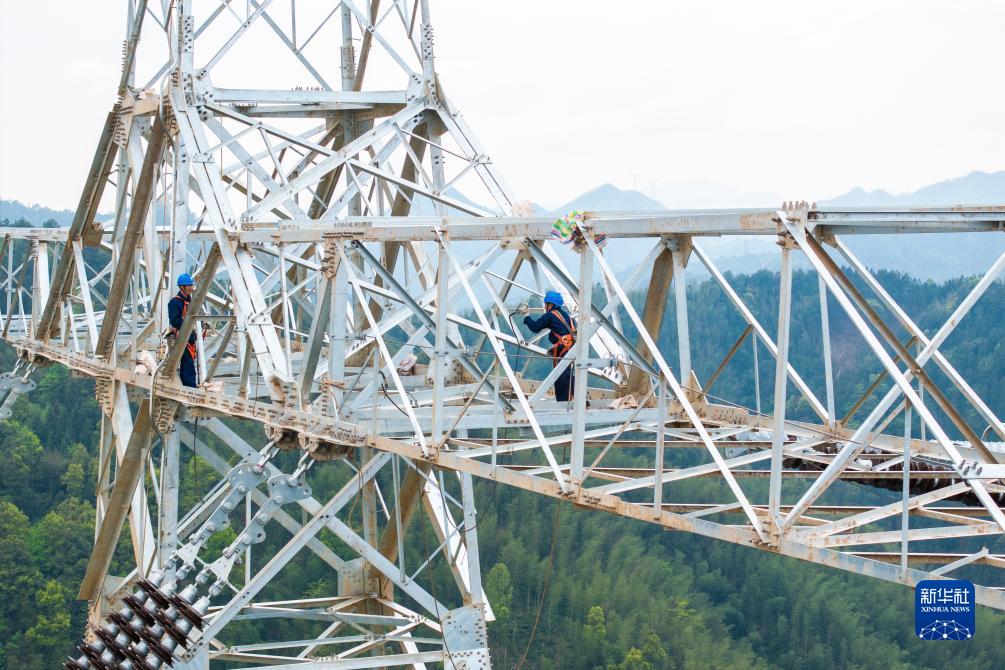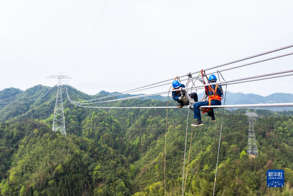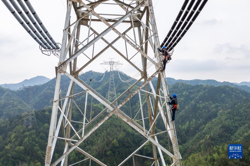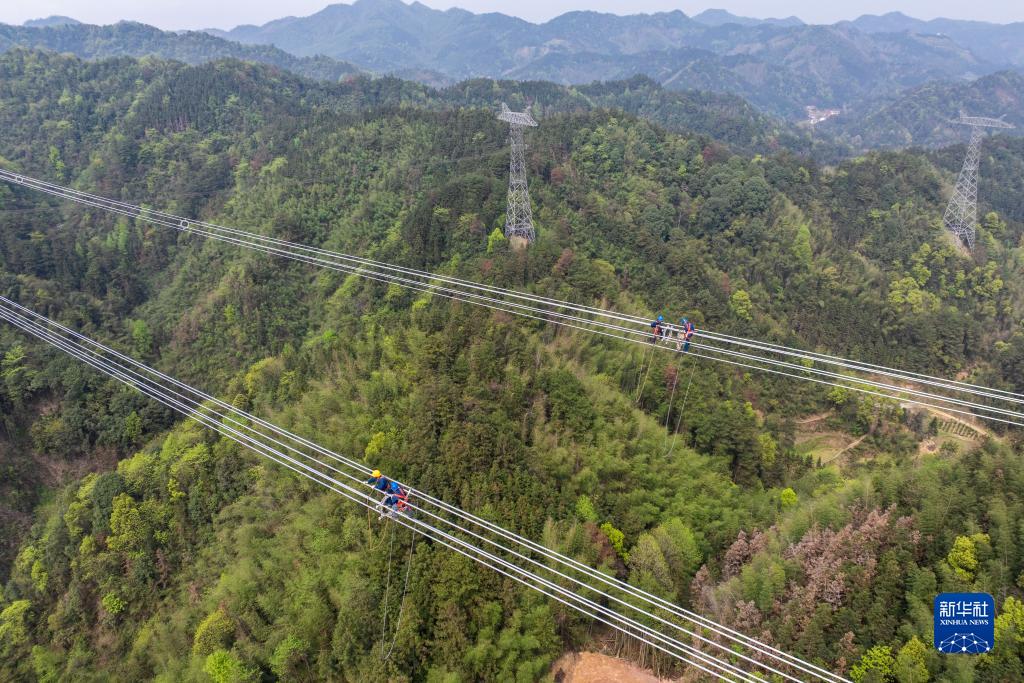 4月1日,在“寧電入湘”工程跨越賓金線架線施工現場,電力工人在安裝間隔棒(無人機照片)。 當日,在湖南省益陽市安化縣冷市鎮,湖南省送變電工程有限公司電力工人完成“寧電入湘”工程跨越賓金線架線施工,為“寧電入湘”工程早日建成運營奠定基礎。據了解,“寧電入湘”特高壓線路工程是我國首個沙漠、戈壁、荒漠地區風電光伏基地外送電的特高壓工程。工程建成投運後,湖南將用上來自西北的清潔能源,每年可從寧夏向湖南輸送電量超360億度,減少二氧化碳排放超1600萬噸,有效提升湖南地區電力供應保障能力,實現湖南中長期電力供需平衡。 新華社記者 陳思汗 攝