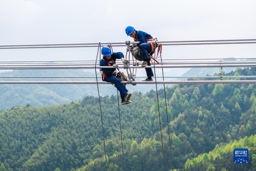 4月1日,在“寧電入湘”工程跨越賓金線架線施工現場,電力工人在安裝間隔棒(無人機照片)。 新華社記者 陳思汗 攝