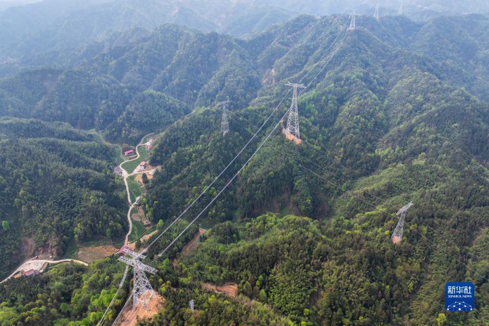 這是4月1日在湖南省益陽市安化縣冷市鎮拍攝的“寧電入湘”工程跨越賓金線架線施工現場(無人機照片)。 新華社記者 陳思汗 攝