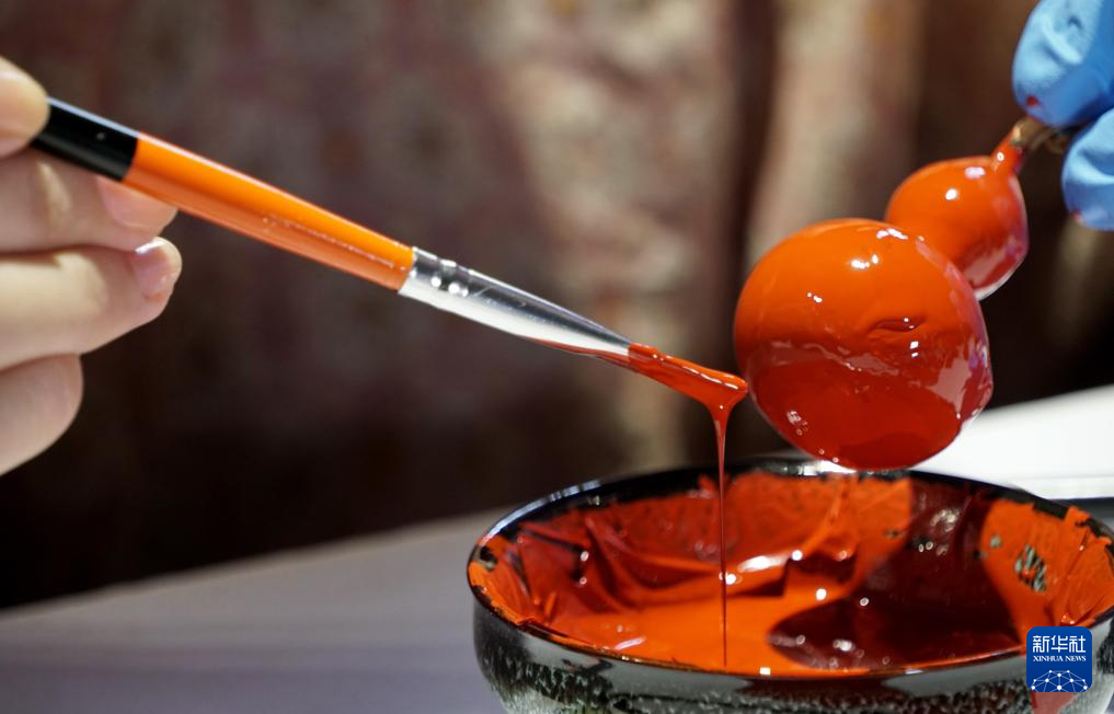 海燕在為葫蘆髹漆準備製作雕漆文創産品(9月8日攝)。
