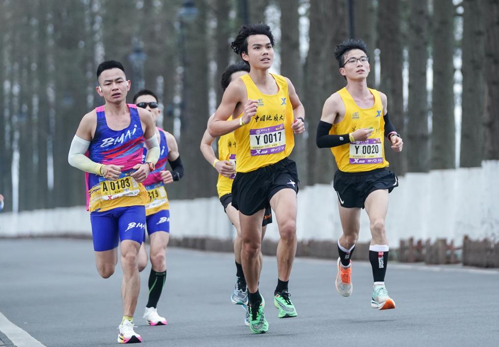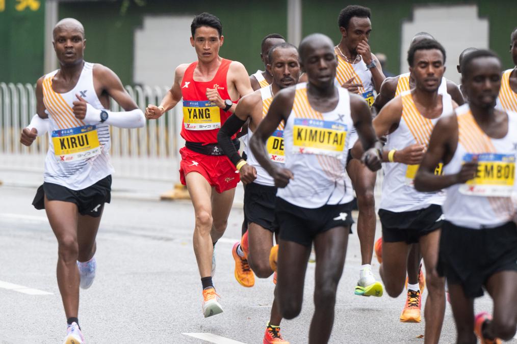 3月24日,中國選手楊定宏(左二)在比賽中。他以2小時12分06秒的成績成為全程馬拉松男子組首位衝線的中國選手。新華社記者 肖藝九 攝