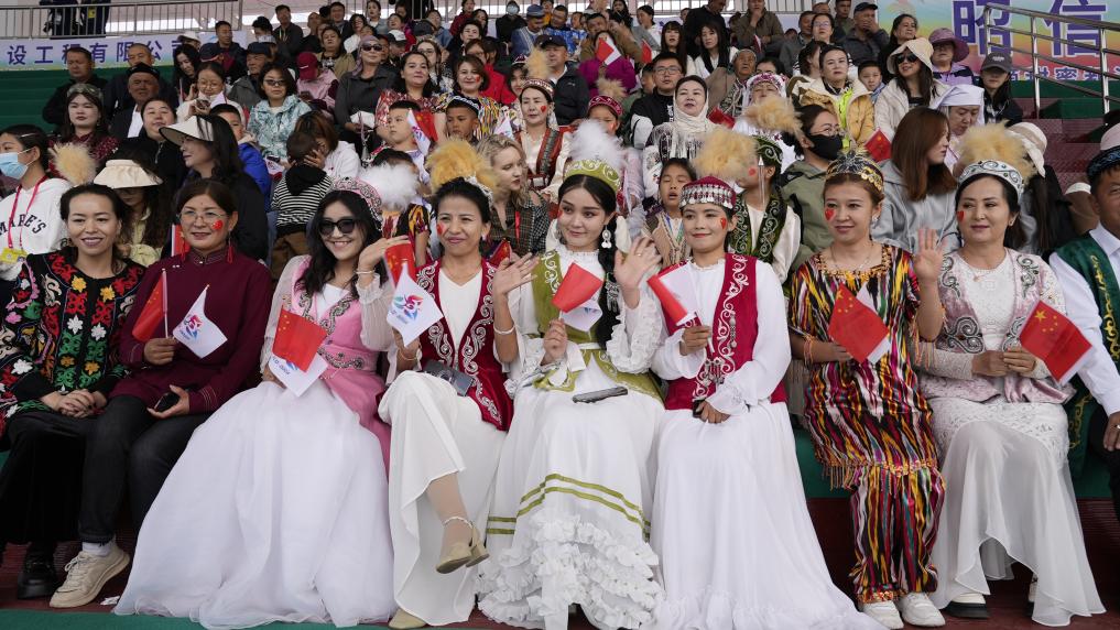 ↑新疆代表團運動員參加表演項目競技類“姑娘追”比賽