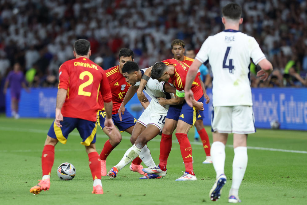 7月14日,西班牙隊球員羅德里(左二)、莫拉塔(右二)在比賽中防守英格蘭隊球員貝林厄姆(左三)。 新華社記者 潘昱龍 攝