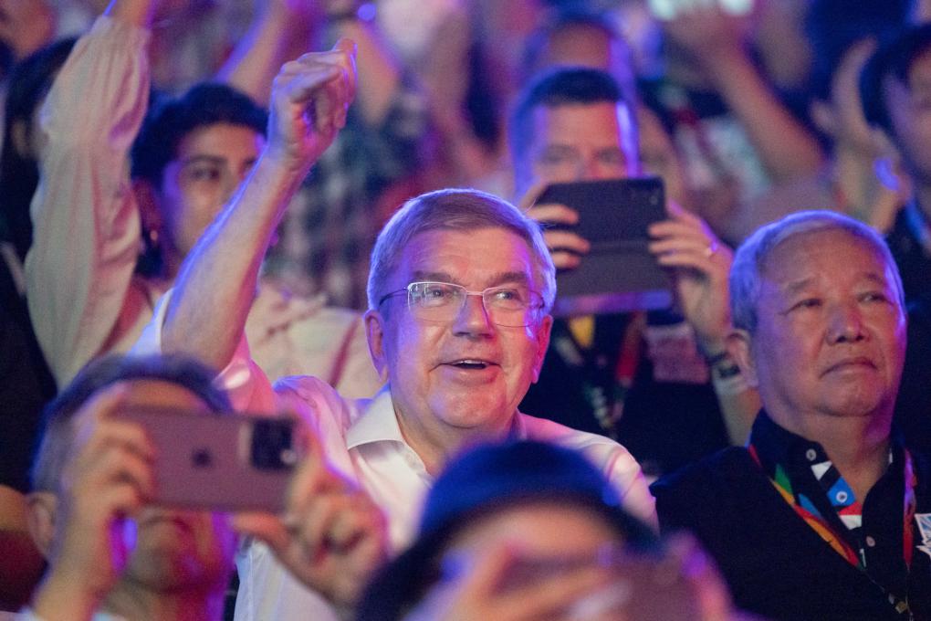 5月19日,國際奧委會主席巴赫(中)觀看巴黎奧運會資格系列賽上海站霹靂舞男子決賽中。新華社記者 王翔 攝