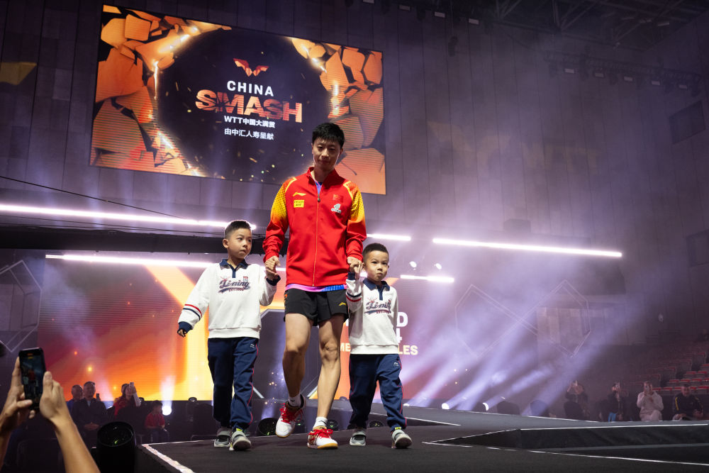 當日關注度最高的賽事莫過於奧運“六冠王”馬龍在男單賽場對陣皮切福特。馬龍賽前牽着自己的兩個孩子入場。在家人的注視下,他首局與對手戰至5:5平,隨後連得6分勝出。後兩局馬龍也沒有給對手太多機會,以11:8、11:7連勝,總比分3:0晉級。