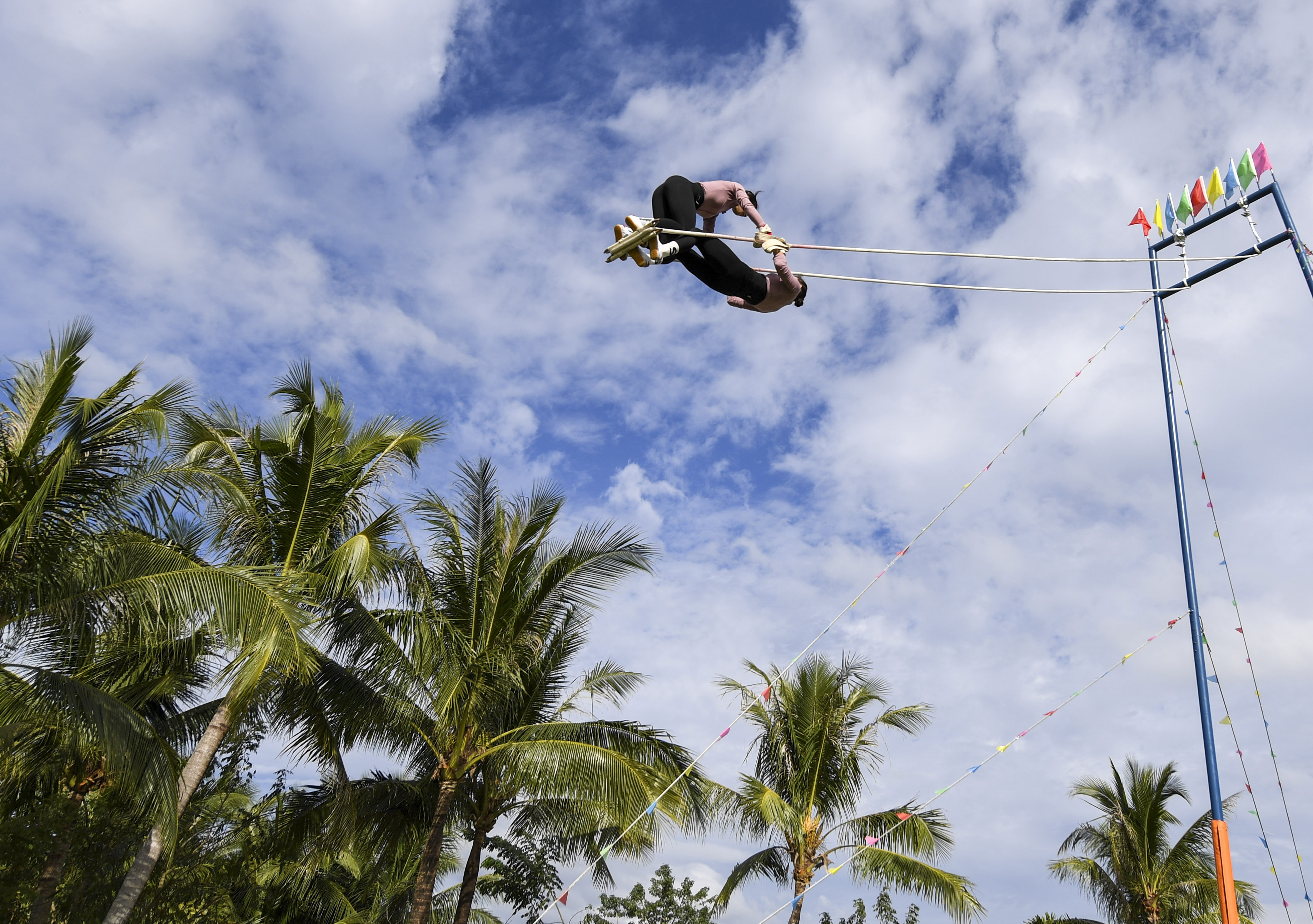 攀爬椰樹在海南黎族苗族傳統節日“三月三”節慶活動