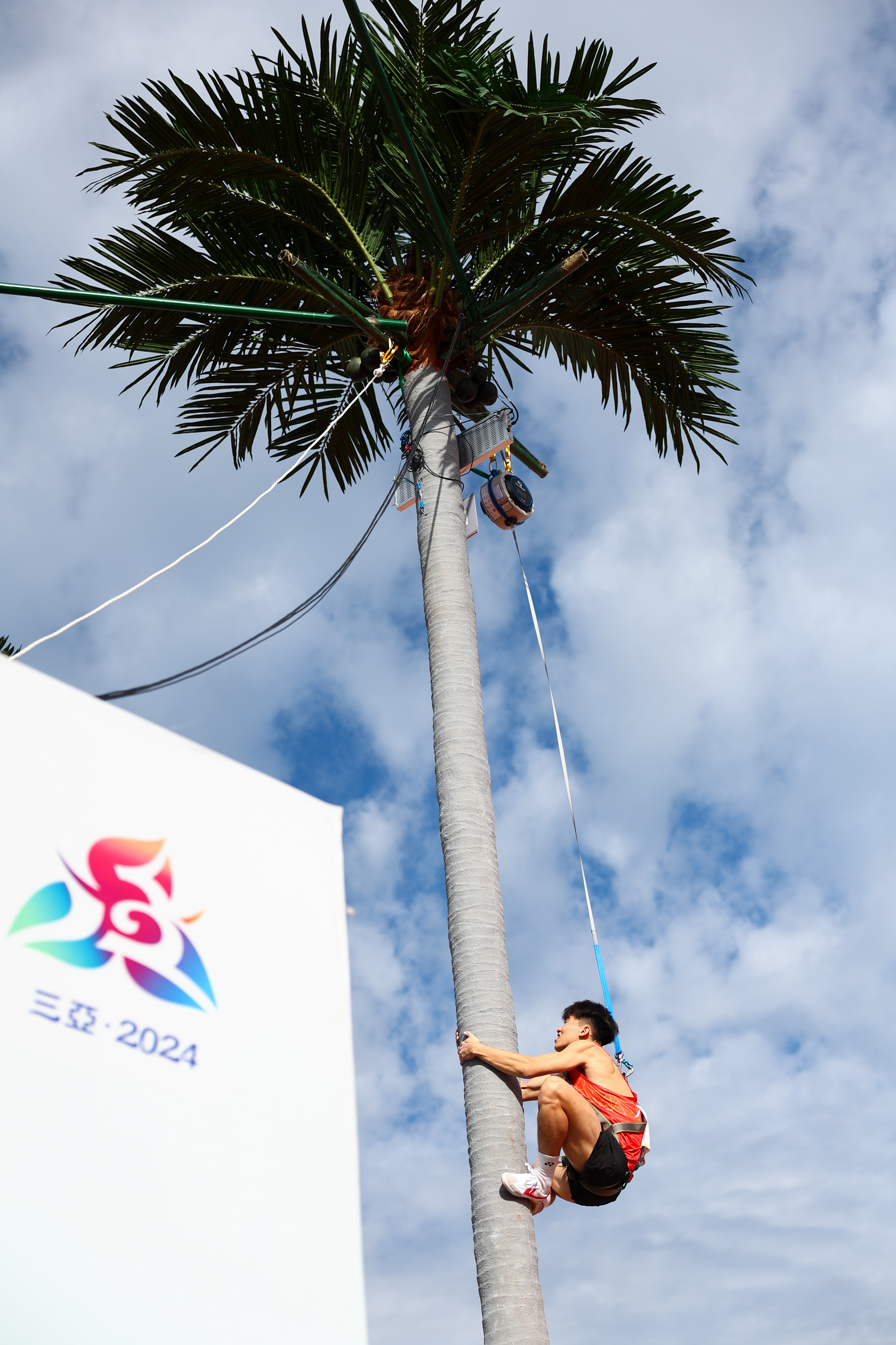 攀椰競速就源於海南各民族群眾爬樹摘椰子的生活勞作場景