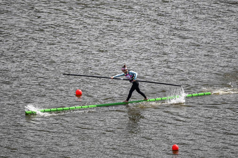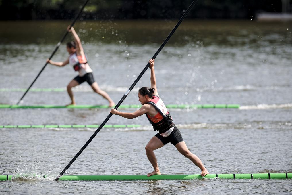 11月27日,雲南隊選手陳良背(前)在決賽中,最終她獲得二等獎。當日,第十二屆全國少數民族傳統體育運動會獨竹漂女子組60米直道賽決賽在海南省三亞市舉行。新華社記者 江漢 攝