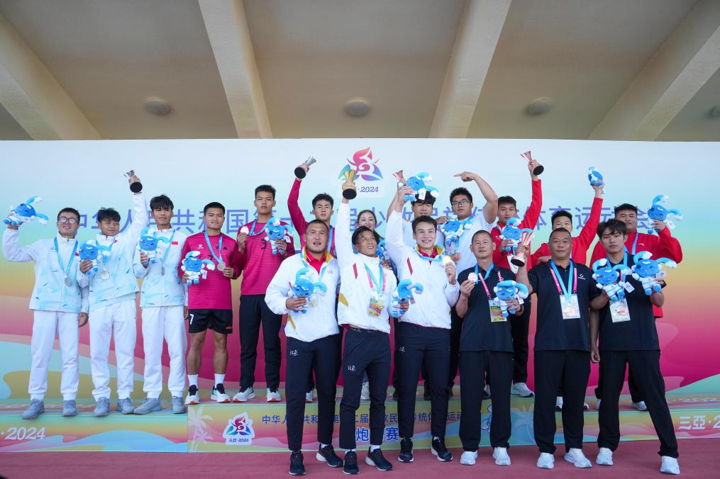 11月29日,北京隊成員在比賽後慶祝。當日,在第十二屆全國少數民族傳統體育運動會花炮決賽中,北京隊戰勝廣西隊,獲得一等獎。新華社發(杜笑微 攝)