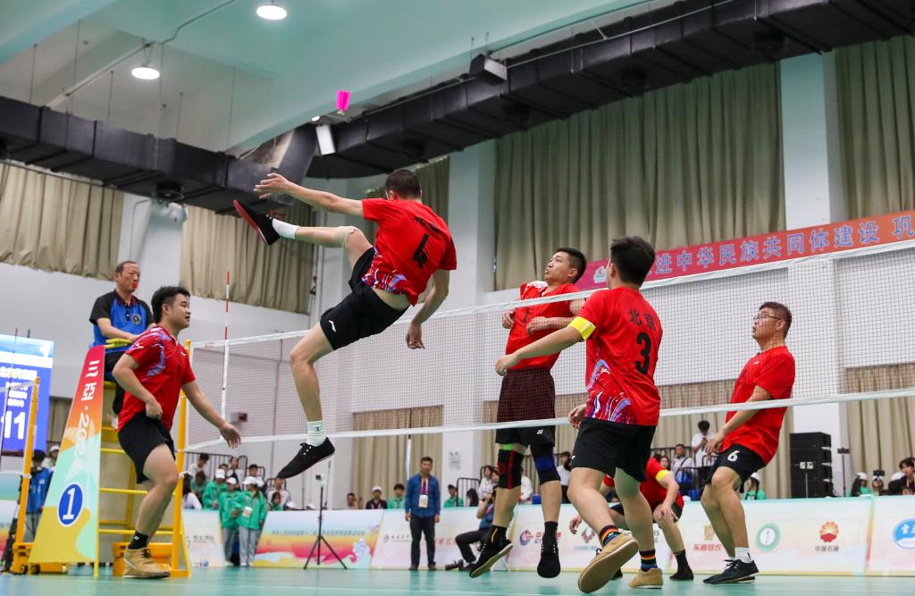 11月29日,北京隊球員魏來(左二)在比賽中進攻。當日,在海南省三亞市舉行的第十二屆全國少數民族傳統體育運動會毽球項目男子三人賽決賽中,北京隊2:1戰勝廣東隊,獲得一等獎。廣東隊獲得二等獎。新華社記者 李旭倫 攝