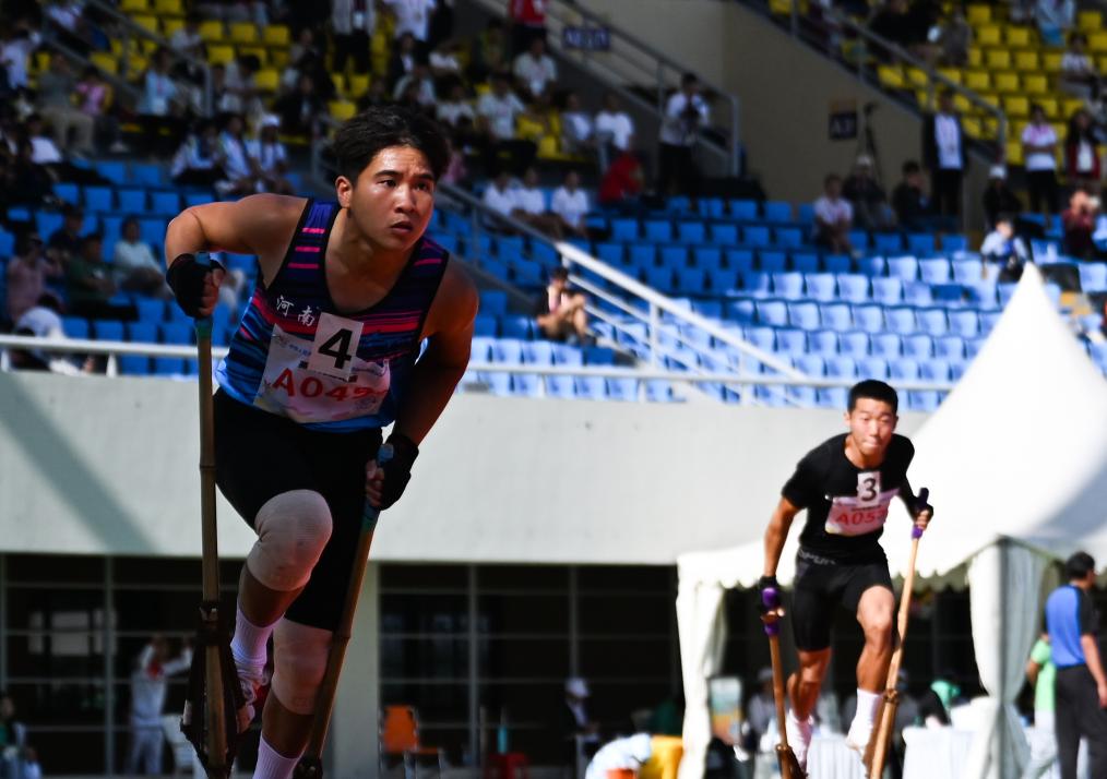 11月29日,河南隊選手韋巍(左)在比賽中。最終,河南隊獲得三等獎。當日,第十二屆全國少數民族傳統體育運動會高腳競速男子2x200米接力決賽在海南省三亞市舉行。新華社記者 張博文 攝