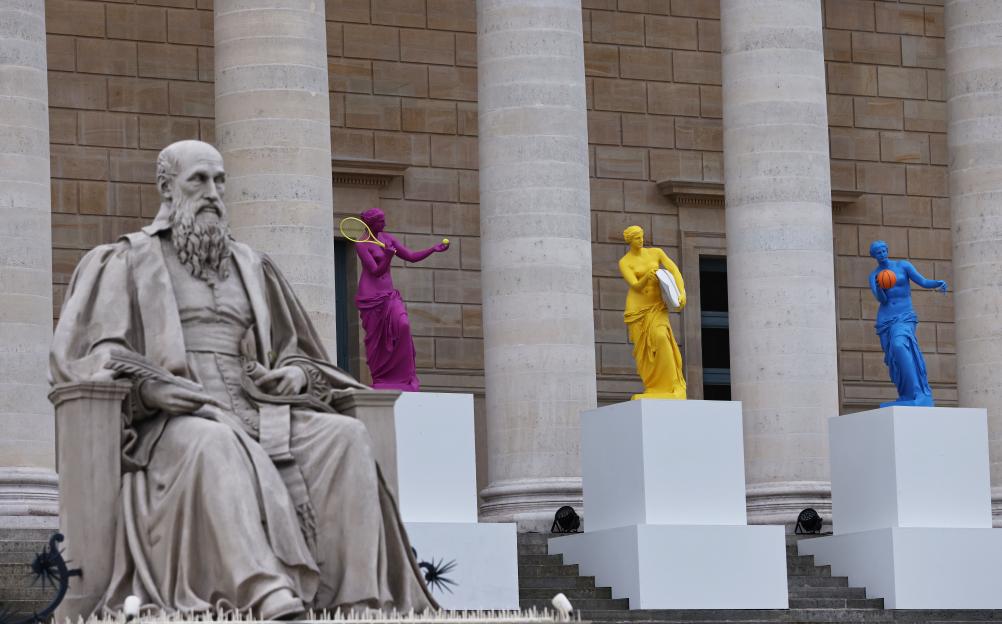 巴黎奧運會開幕前在法國巴黎國民議會前拍攝的奧運主題雕像