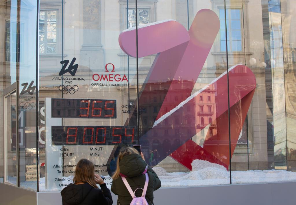 2月6日,在意大利米蘭,人們在2026年米蘭-科爾蒂納丹佩佐冬奧會倒計時牌前拍照。新華社記者 李京 攝
