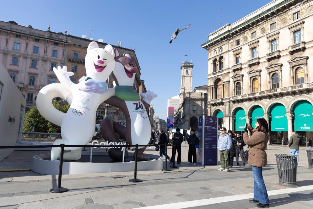 6日上午,國際奧委會與米蘭冬奧組委在米蘭共同舉行倒計時一周年慶祝活動。米蘭大教堂廣場上,一塊巨大的倒計時牌正式啟動,與冬奧會吉祥物——白鼬姐弟蒂娜和米羅一同亮相,吸引大批市民和游客駐足拍照,現場氣氛熱烈。