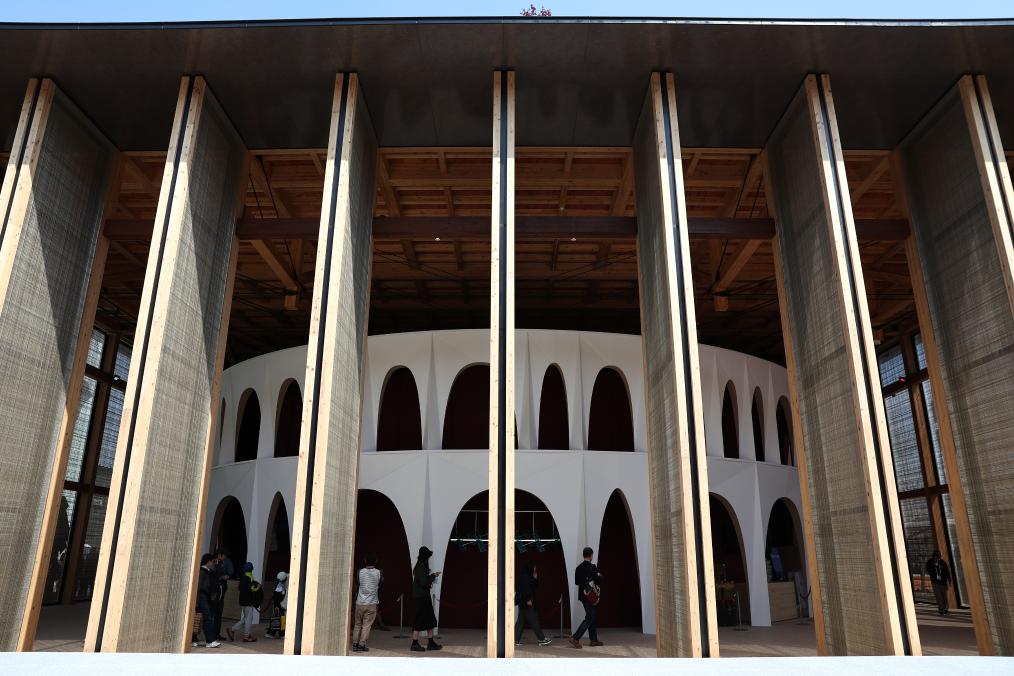 4月14日,游客在日本大阪參觀世博會意大利館